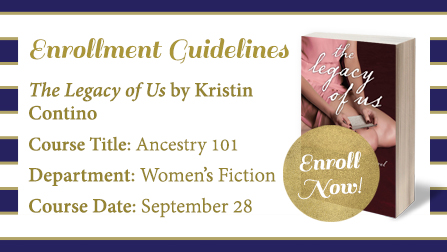 Happy Monday! This week’s course at BookSparks University for the 2015 Fall Reading Challenge is Ancestry 101 and we are reading The Legacy of Us by Kristin Contino.