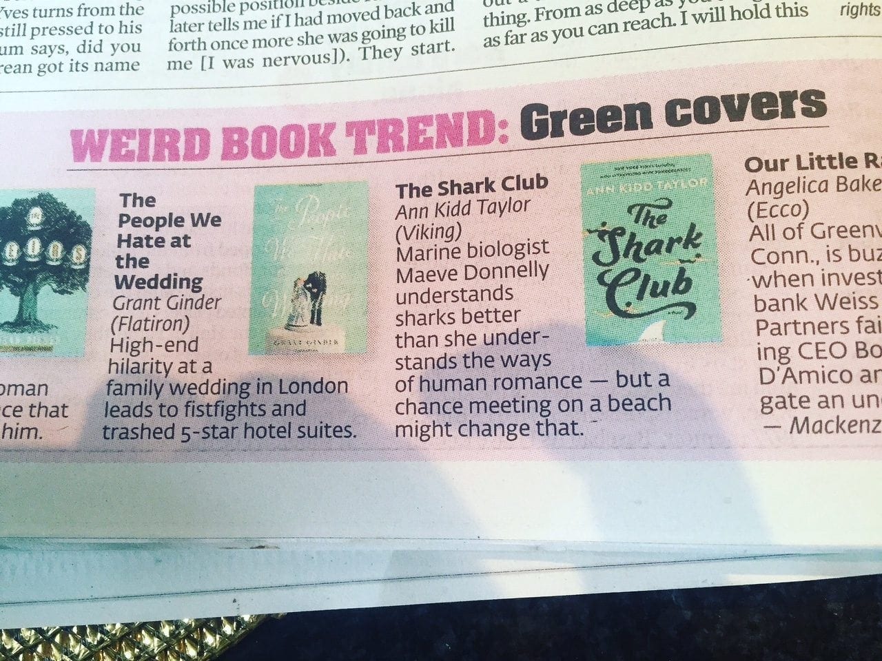 The New York PostĀ pointed out a cool new trend: green book covers, featuring The People We Hate At The Wedding by Grant Ginder andĀ The Shark Club by Ann Kidd Taylor.
