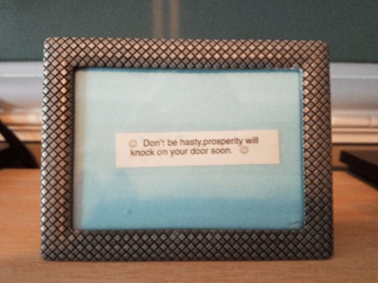 But the most important item is a tiny rectangular piece of paper that serves as a reminder in the times that all those other things fail to help me create. Sitting on the desk in my office is a picture frame containing a fortune I received six or seven years ago in a Chinese takeout order. It couldnāt have come at a more perfect time in my writing career ā a day when I had received around my 100th rejection on my second book and I truly needed a sign to keep going. And while Iām not a superstitious person, I will admit it was the fortune that convinced me to write just one more book. And I am so glad I did.